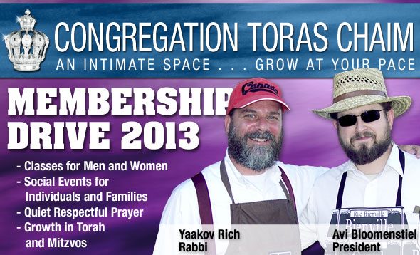 Of course, there are practical considerations to shul building, which includes, most of all, funding. Though not as important as community building, it is absolutely necessary to the shul’s continued operation. Membership at Congregation Toras Chaim is both a way to contribute to the financial health of the shul and to strengthen the bonds of the shul community. As the main source of funding for Toras Chaim’s programs and activities, your membership benefits the entire shul community.