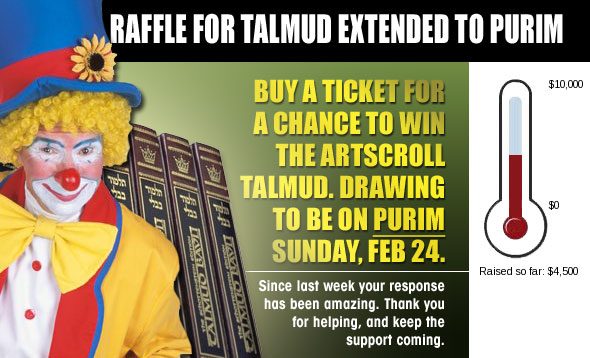Now for the good news. You know, we tried hard to find some, but we just couldn’t. There’s just no good news. For us, that is. But for you, it is all good news. That is, since we sold so few tickets, we were forced to extend the drawing until Purim. With so few tickets sold, your chances of winning are huge. This is really the opportunity of a lifetime. For just $100 you can have a legitimately great chance to win the entire Talmud. I know, you’re saying, “What am I going to do with a set of Artscroll gemaras?” Well, you could study it?! Or, if you insist on leaving it sit on the bookshelf, they do a fantastic job of collecting dust. Think of them as a Talmudic air filter.