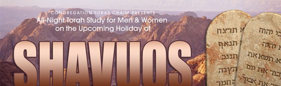 Shavuos arrives next week and one of the ways that Jews all over the world prepare for the Giving of the Torah on Shavuos morning is to stay awake all night Erev Shavuos in order to show Hashem that we are ready to receive it. In keeping with that tradition, Congregation Toras Chaim is pleased to offer it’s 6th Annual All-Night Shavuos Learning next Tuesday night, June 3rd. The evening’s learning is sponsored in the memory Shoshana bas Tzvi Eliezer (Rosalie Rich), donated by Michael & Donna Rich.