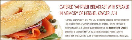 Sunday, September 4 at 9 AM, CTC is hosting a special catered breakfast for all adult men & women and teens, no charge, on the yahrtzeit of Hershel Krycer, A”H. Special guest speaker will be Rabbi Peretz Shapiro. Breakfast is sponsored by Dr. BJ & Brocha Adrezin. Please RSVP to Rabbi Rich at (972) 835-6016 or [email protected]. Thank you.