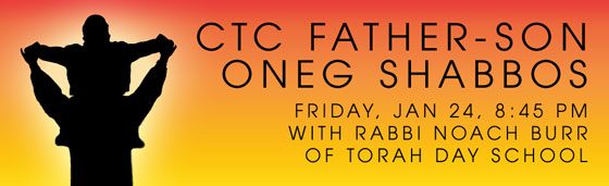 - First, and foremost Rabbi Burr will be the featured speaker, singer & ruach-maker at a CTC Father-Son Oneg Shabbos this Friday night, January 24, 8:45 PM at the Rich home, 7119 Bremerton Ct., Dallas, TX 75252. This oneg is open to all Fathers and Sons in the community. There will be plenty of delicious food to eat, beverages to drink, and divrei Torah to just soak up. We encourage all fathers and sons, of any age, to participate.