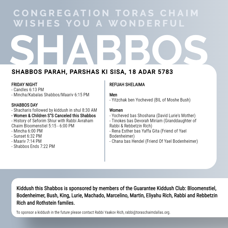 CTC Shabbos Parah, Parshas Ki Sisa 5783 Please leave this field empty Subscribe to CTC Email Check your inbox or spam folder to confirm your subscription.
