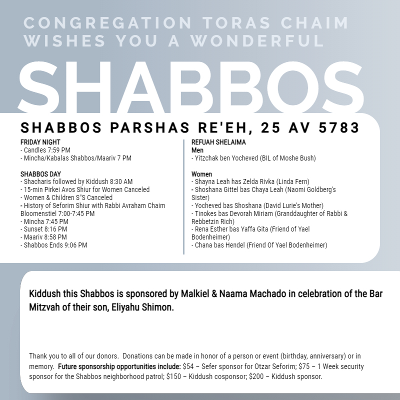 CTC Shabbos Parshas Re’eh 5783 Please leave this field empty Subscribe to CTC Email Check your inbox or spam folder to confirm your subscription.
