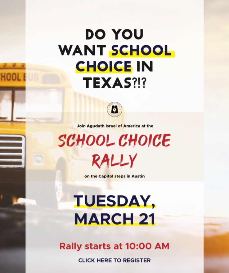 #1) Sign Up for the Rally NowJoin Agudath Israel of America at the Texas School Choice Rally At The Capitol #2) Take Action NowPlease Urge Texas Lawmakers to Support ESA’s for All Families Please leave this field empty Subscribe to CTC Email Check your inbox or spam folder to confirm your subscription.