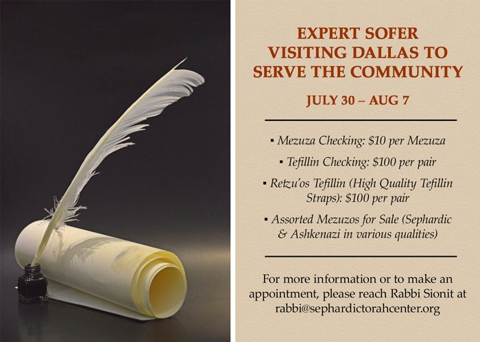 Rabbi Yerachmiel Askotzky of Israel, an expert in all areas of Safrus (writing, checking and maintenance of Torah scrolls, Tefillin and Mezuzos) will be in Dallas July 30 to Aug 7 and ready to serve the community with Safrus needs.