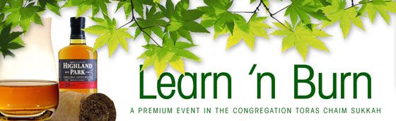 Congregation Toras Chaim welcomes you to the sixth annual Learn ‘n Burn. Learn ‘n Burn is a chance for the guys to relax, hear inspiring Divrei Torah, enjoy some of the finest single malt scotches, bourbons, imported Belgium beers together with amazing samples from our own best craft breweries, and, smoke quality cigars (if that is your liking :-) all within the kedusha of the succah.