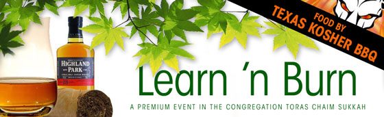 Congregation Toras Chaim welcomes you to the Eighth Annual Learn ‘n Burn. This special program is a chance for the guys to relax, hear inspiring Divrei Torah, enjoy some of the finest single malt scotches, bourbons, imported Belgium beers together with amazing samples from our own best craft breweries, and, smoke quality cigars (if that is your liking :-) all within the kedusha of the succah.