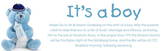 Mazel Tov to Ari & Naomi Goldberg on the birth of a boy. May the parents merit to raise their son to a life of Torah, Marriage and Mitzvos, and bring him to the bris of Avrohom Avinu, in the proper time. IY”H the Shalom Zachor will be this friday night at the Goldberg home, and the Bris will be Shabbos morning, following davening at CTC.