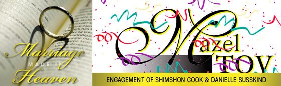 Mazel Tov to Shimshon Cook & Danielle Susskind on their engagement. May they merit to build a Bayis Ne’eman B’Yisroel. Please leave a comment/brocha below. Please leave this field empty Subscribe to CTC Email Check your inbox or spam folder to confirm your subscription.