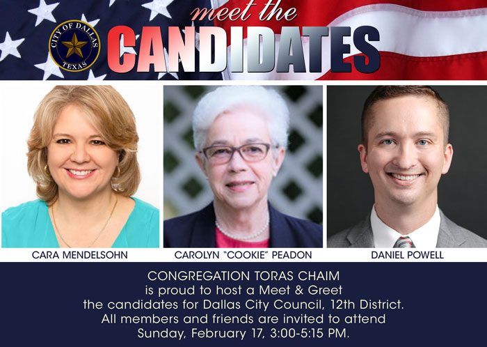 Congregation Toras Chaim is proud to host a Meet & Greet the candidates for Dallas City Council, 12th District. All members and friends are invited to attend Sunday, February 17, 3:00-5:15 PM.