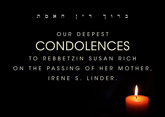 Our deepest condolences to Rebbetzin Susan Rich on the passing of her mother, Irene S. Linder. The graveside funeral service will take place tomorrow, Monday, April 29, 2019, 12 PM, at Restland Cemetery, Mount Zion Section, 13005 Greenville Ave, Dallas, TX 75243.