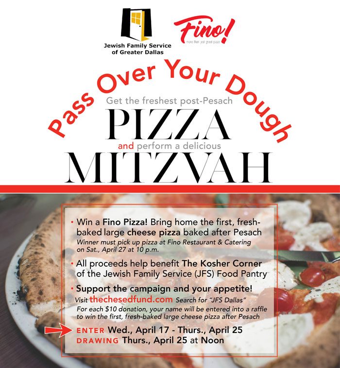 Visit thechesedfund.com. Search for “JFS Dallas” For each $10 donation, your name will be entered into a raffle to win the first, fresh-baked large cheese pizza after Pesach.