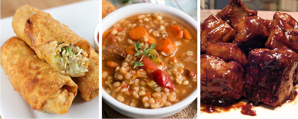 Zucchini Soup;Â Mushroom Barley Soup;Â Hearty Vegetable Soup;Â Potato Knishes;Â BBQ Beef Tips;Â Chicken Satay;Â Mini Egg Rolls;Â Asian Slaw;Â Chopped House Salad;Â Corn Salad;Â Assorted Crackers;Â Rolls;Â Finger Sweets; Assorted Wines; Cinnamon Vanilla Vodka Decaf Coffee: other assorted alcoholic and non-alcoholic beverages