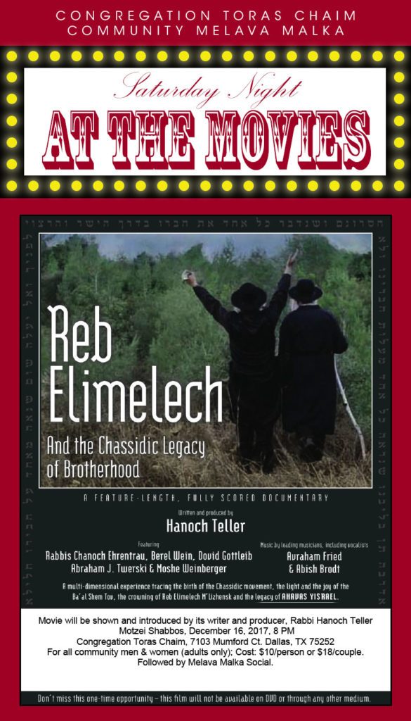 - SATURDAY NIGHT, 8 PM, FEATURE MOVIE FOLLOWED BY MELAVA MALKA SOCIAL IN SHUL for adults only ($10/person or $18/couple admission)Â Reb Elimelech of Lizhensk and the Chassidic Legacy of Brotherhood (See below for the full Melava Malka menu. Pretty yummy.)