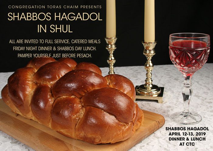 Congregation Toras Chaim invites you to participate in Shabbos Hagadol in Shul Dinner & Lunch. The finest catered cuisine, full-service meals, with great ambiance.