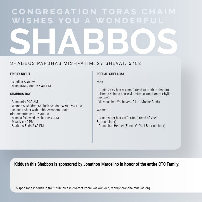 Shabbos Parshas Mishpatim 5782 Please leave this field empty Subscribe to CTC Email Check your inbox or spam folder to confirm your subscription.