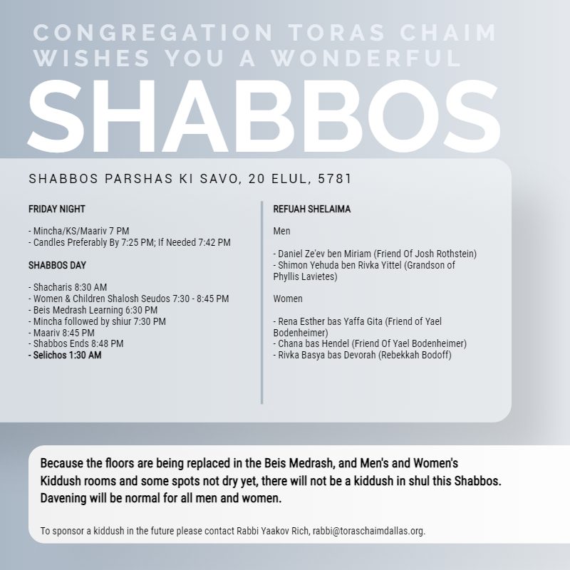 Shabbos Schedule Parshas Ki Savo 5781