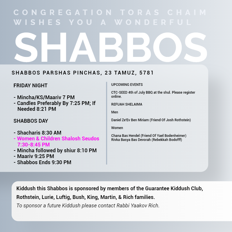 Shabbos Schedule, Parshas Pinchas, 23 Tamuz, 5781