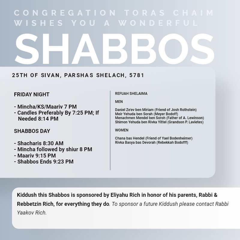 Shabbos Schedule, Parshas Shelach,25 Sivan, 5781