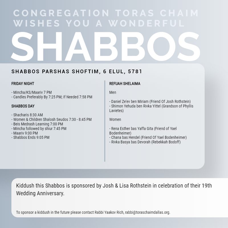 Shabbos Schedule Parshas Shoftim 5781
