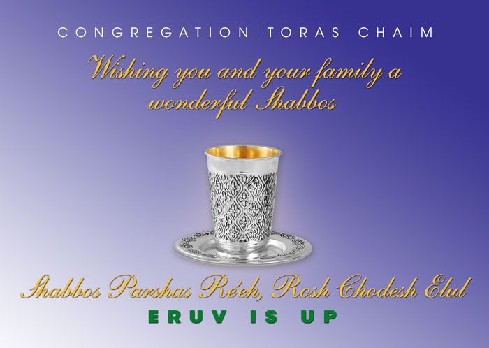 The CO Celebratory Kiddush this Shabbos is cosponsored by: Yosef Reynolds in memory of Hershel Krycer, whose Yahrtzeit is 1 Elul; Chana Esther Day in memory of her husband, Bob Day, whose Yahrtzeit is 4 Elul; Yitzchok Elchonon & Racheli Rich, Avrohom Moshe Rich, Eliyahu Rich, Greg Haggman, Nechemyah Rich, Shoshana Rich, Josh & Lisa Rothstein, Ari & Naomi Goldberg, Cary Alvarado, Mayer Porter, Ben & Lauren Nise, Joan Slabiak, Rabbi Yaakov & Rebbetzin Susan Rich, Eli Goldberg, Myron & Malka Lurie, Yitzchok & Tami Ellis, Moshe Plotkin, Dan & Phyllis Lavietes, Pinchas & Tricia Sutkin, Moshe & Ariella Bush, Elliot & Rivkah Azoulay, Mark & Michelle Gothelf, Yoseif & Avigail Hargrove, Haiim & Ellen Gutgold, Abraham & Hillary Lewinsohn, Shira Ahuva Rich, Ken & Lori Jarmel, Michoel & Yale Bodenheimer, Yerachmiel & Shira Martin, Bruce & Shanie Dunn, Chana Esther Day, Riva Gorelick, Adira Benklifa, Shaul & Chaya Miriam Cajas, Avi Riber, Avi & Shuli Bloomenstiel, Jeff & Suzanne Luftig, Reuven & Devorah King, and Reuven & Selina Wortrich, all in honor of the shul.