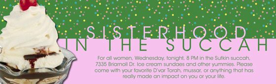 For all community women. No charge. Wednesday, October 19, 8 PM in the Sutkin succah, 7335 Briarnoll Dr. Ice cream sundaes and other yummies. Please come with your favorite D’var Torah, mussar, or anything that has really made an impact on you or your life.