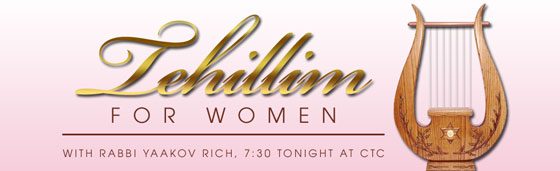 The Sunday night, weekly Tehillim shiur for women with Rabbi Yaakov Rich is restarting, tonight, Sunday, October 6, 2013, 7:30-8:15 PM. Each Sunday night we will examine another psalm, study the poetic language used and delve into its significance & meaning, and most importantly, how we, in the 21st Century, can grow from its message.