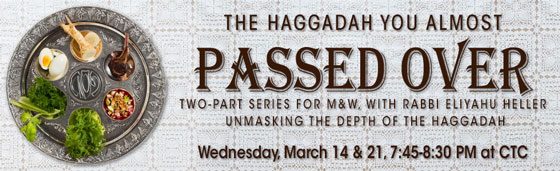 The Haggadah You Almost Passed Over Unmasking the Depth of the Haggadah Two-part series for M&W, with Rabbi Eliyahu Heller Wednesday, March 14 & 21, 7:45-8:30 PM at CTC. No Cost. Please leave this field empty Subscribe to CTC Email Check your inbox or spam folder to confirm your subscription.