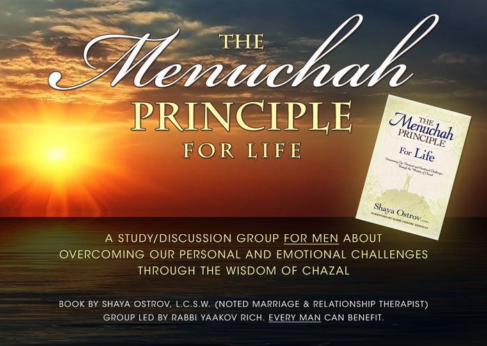 This study/discussion group will be based on the book “The Menuchah Principle for Life” by Shaya Ostrov, L.C.S.W. (Noted Marriage & Relationship Therapist). This group is for men, will be led by Rabbi Yaakov Rich, and will meet at Congregation Toras Chaim, 7103 Mumford Ct., Dallas 75252, Thursday evenings, 7:15-8:15 PM.