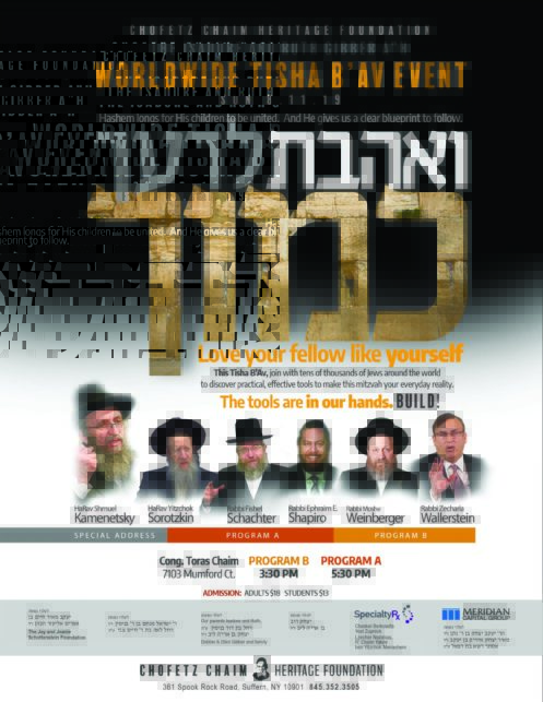 This Tisha B’Av, the annual Chofetz Chaim World-Wide Event focuses on the single mitzvah most vital to bringing Klal Yisrael out of galus. “V’ahavta l’rei’acha kamocha: The Blueprint for Rebuilding the Beis HaMikdash,” explores this seemingly simple yet elusive mitzvah, and reveals a system anyone can use to make major strides in the right direction.