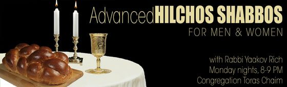 Advanced Hilchos Shabbos for Men & Women with Rabbi Yaakov Rich, Monday nights, (beginning November 20), 8-9 PM at Congregation Toras Chaim.