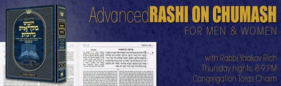 Advanced Rashi on Chumash for Men & Women with Rabbi Yaakov Rich, Thursday nights, (beginning November 16), 8-9 PM at Congregation Toras Chaim.