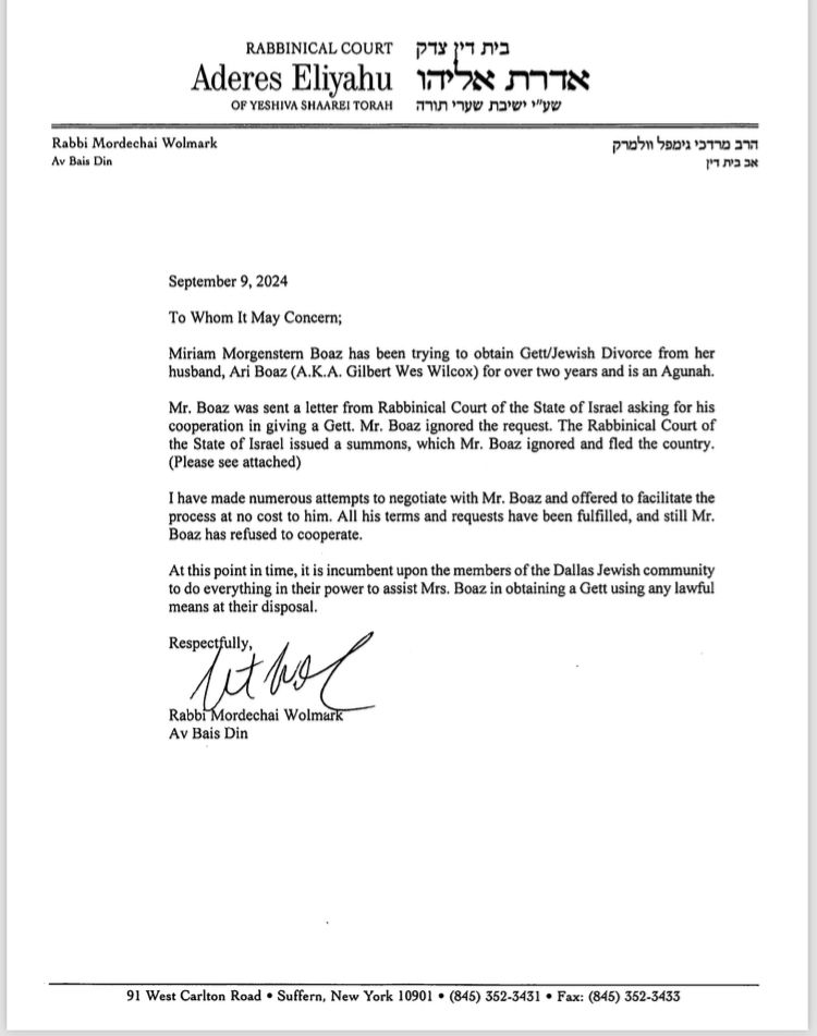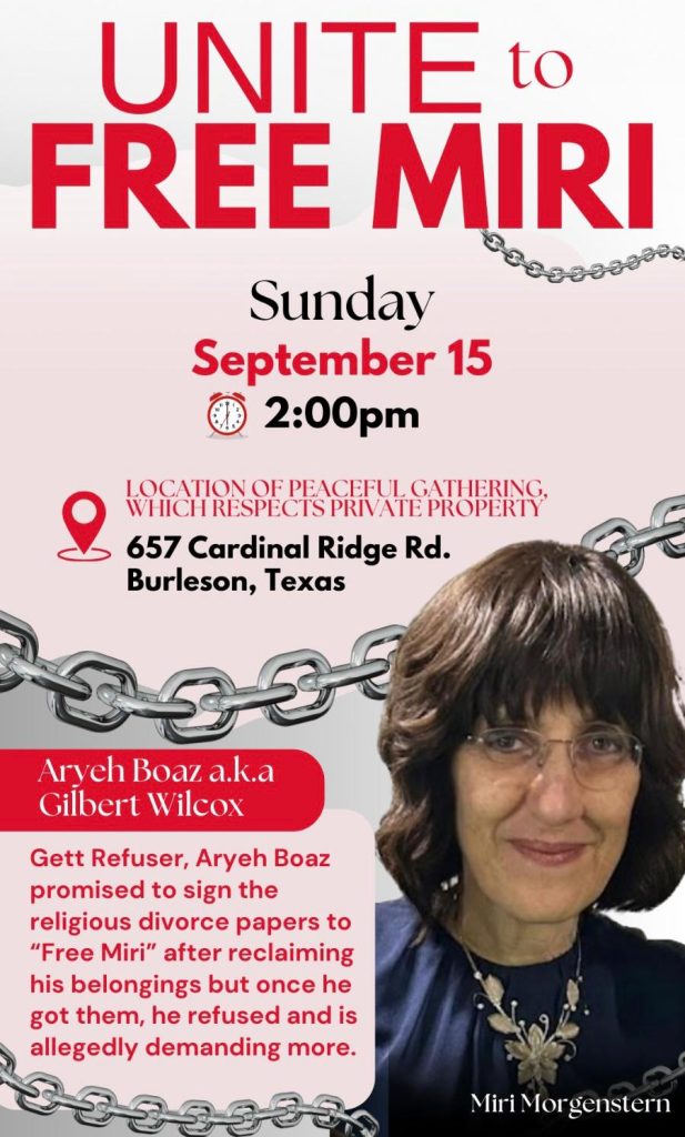 Miri Morgenstern was an important member of the Dallas community for many years who is now living in Israel. Her husband, Aryeh Boaz (aka Gilbert “Bo” Wilcox), is a convert to Judaism who has since ceased any Jewish practice. Three years ago, he moved back to Texas, and now is holding Miri hostage to their dead marriage by refusing to give her a Get. This is an egregious abuse of the halachic system to torture another person. Assiduous efforts have been made by numerous Rabbis, both locally and out of town, to convince him to grant Miri a get, yet these have so far proven unsuccessful. Please see the attached letter from Rabbi Mordechai Wolmark, a mesader Gittin in Monsey, New York who has been involved in the case, urging our community to do whatever we can to help free Miri.